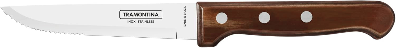 A faca para churrasco jumbo Tramontina Polywood vermelha 5 polegadas é ideal para quem busca eficiência e resistência no preparo e consumo de carnes. Sua lâmina em aço inox conta com tratamento térmico, garantindo maior durabilidade do fio e excelente desempenho no corte, inclusive em carnes mais robustas. O fio serrilhado facilita o corte sem necessidade de afiação constante. Seu cabo em madeira tratada Polywood oferece alta resistência a impactos, umidade e altas temperaturas, proporcionando segurança e conforto no manuseio. Possui rebites de alumínio que aumentam a firmeza e a durabilidade do produto. Com design clássico e robusto, é perfeita para churrascos e uso diário, podendo ser levada à máquina de lavar louças para maior praticidade.