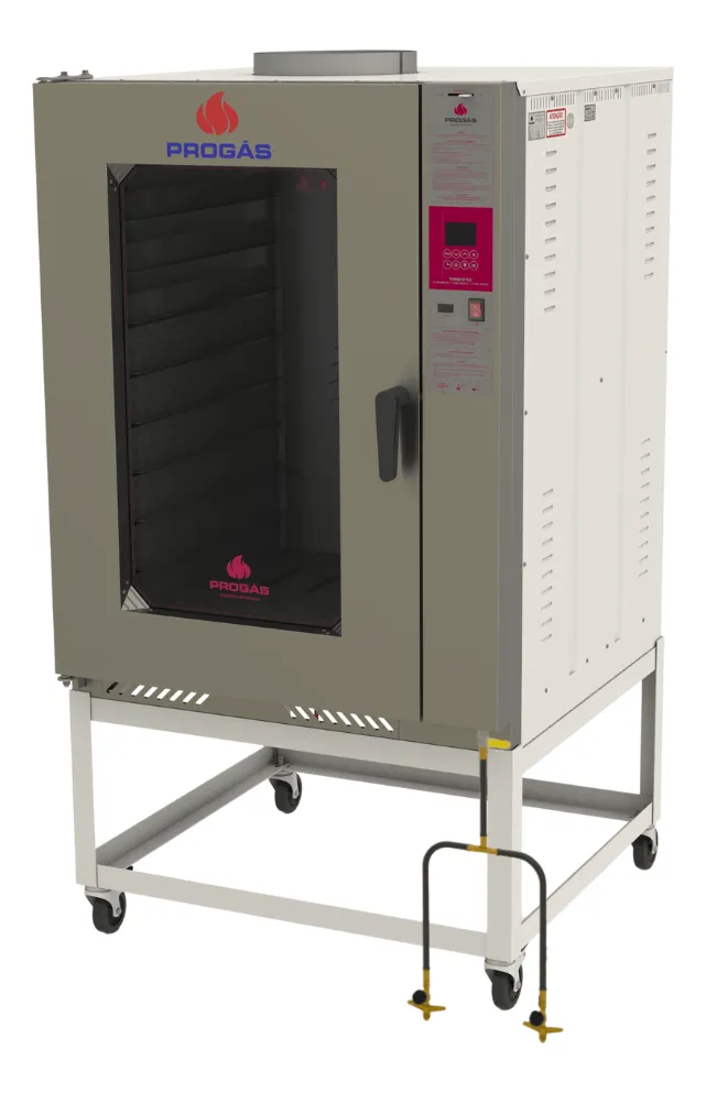 O forno turbo a gás Progás PRP-10000 é a solução ideal para estabelecimentos que precisam de alta produção com qualidade e padronização. Com capacidade para 10 assadeiras, é indicado para padarias, confeitarias e cozinhas industriais que trabalham com grande volume. Seu sistema de circulação forçada de ar quente garante assamento uniforme, eliminando a necessidade de girar as assadeiras durante o preparo. Conta com estrutura robusta em aço carbono com acabamento resistente, isolamento térmico em lã basáltica que reduz perdas de calor e sistema de vapor que proporciona melhor acabamento aos pães. Possui iluminação interna e porta com visor, facilitando o acompanhamento do processo. Além disso, a turbina é acionada automaticamente ao abrir e fechar a porta, oferecendo mais segurança e eficiência no uso profissional.